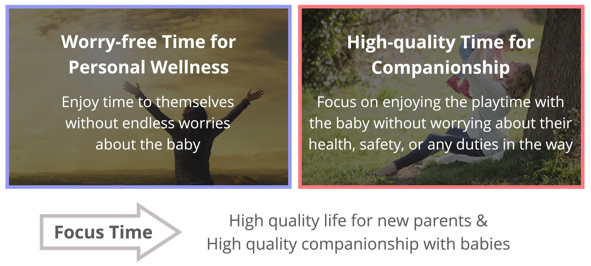 To free those main caregivers from their mental cage, we would like to clear up periods of “focus time” from day to day for them – which means, worry-free time for personal wellness, and high-quality time for bonding and being with their children.