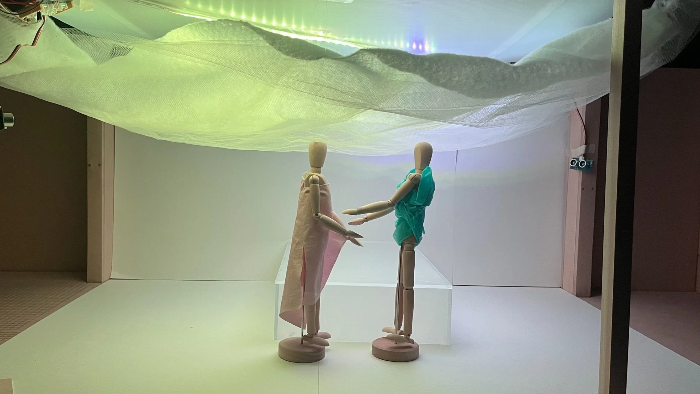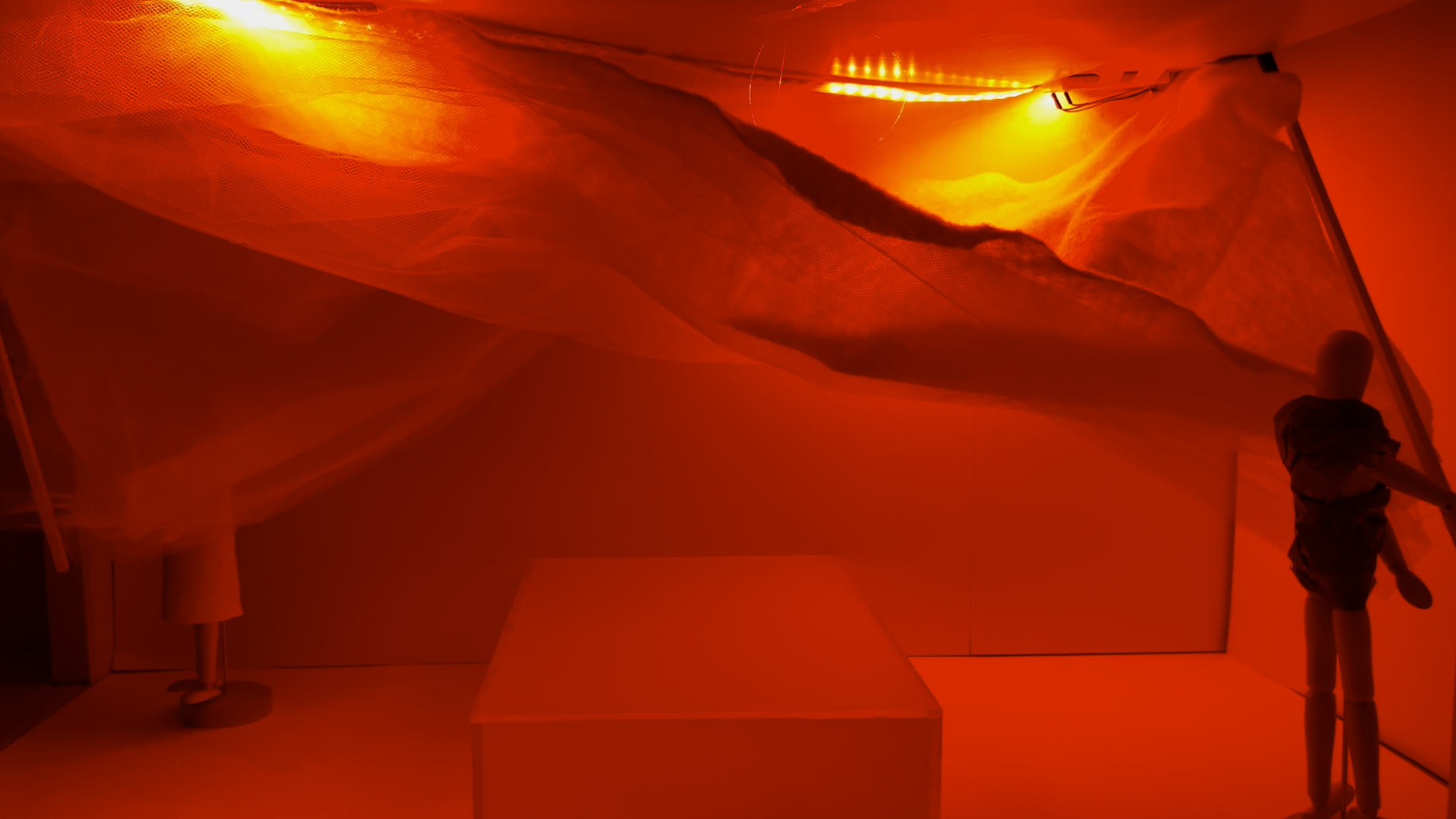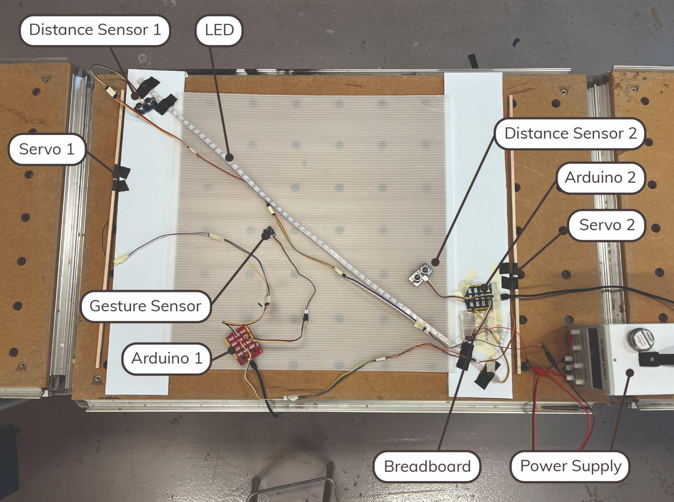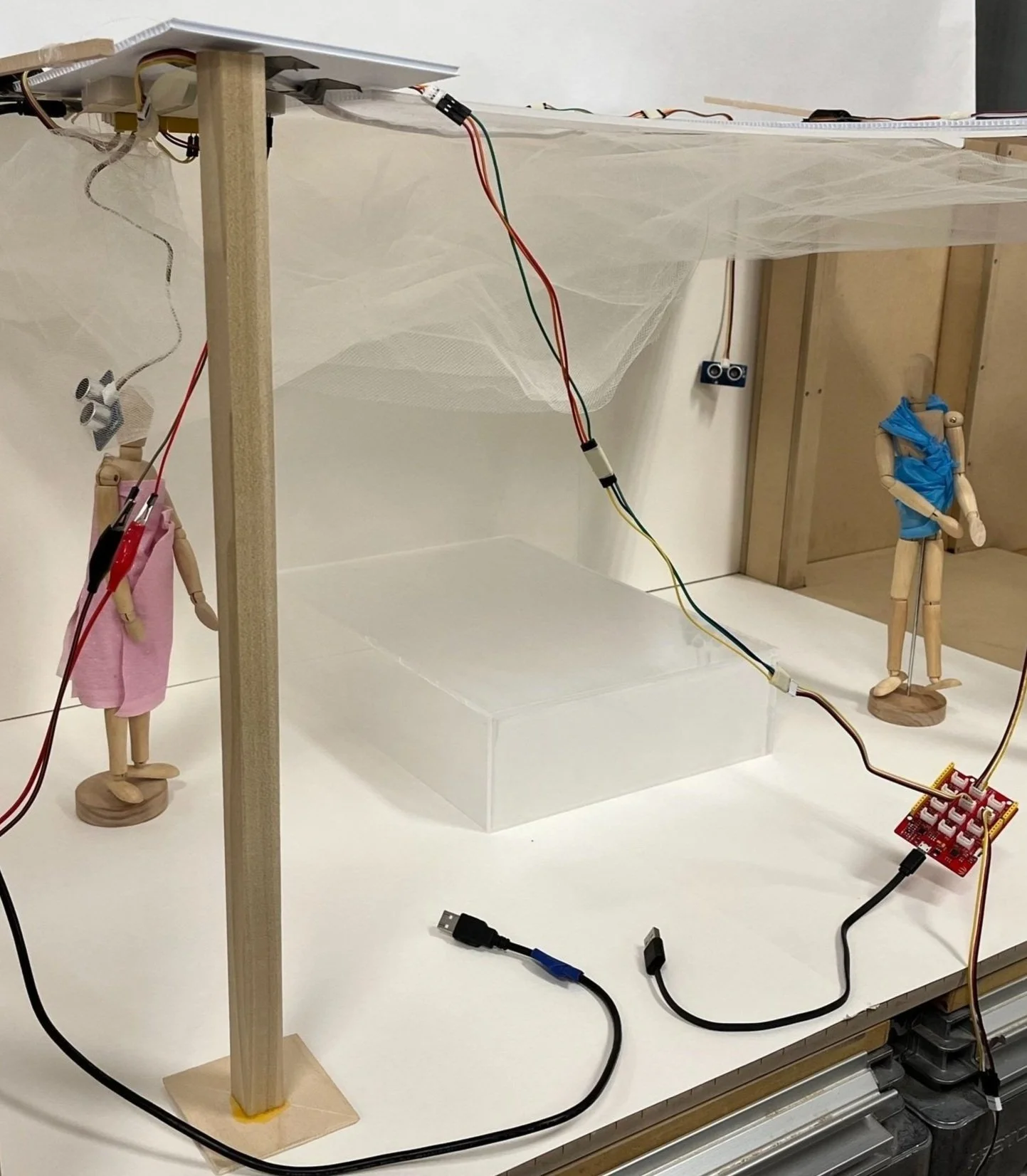 The ceiling is made from tulle and fabric and controlled by two servos on wooden sticks. It reacts to gestures detected by the gesture sensor, while the two ultrasonic distance sensors on the two opposite corners determine the distance between Howard and Fay. The signal is then transmitted to the LED above the ceiling, which lights up with different colors according to the different distances.