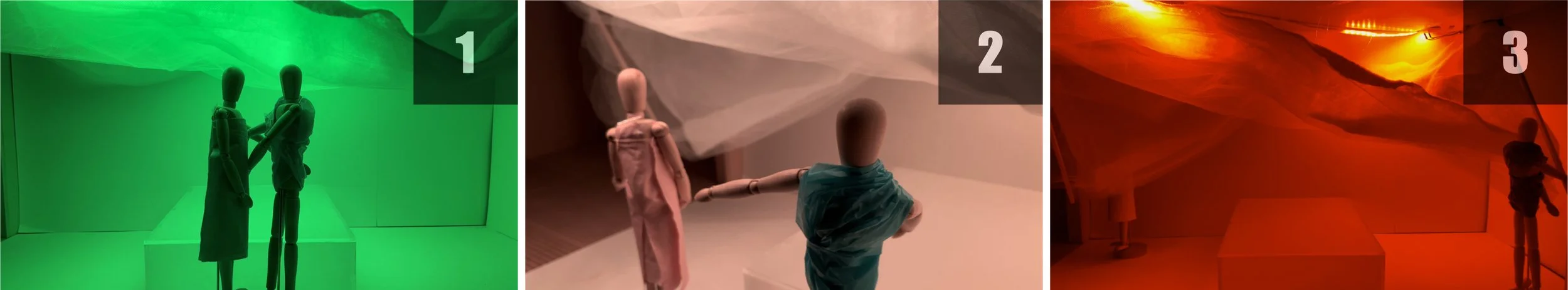 When both Howard and Fay are in the middle of the room, it stays as one open space and lights up in green to reflect the calm and peaceful atmosphere (state 1). When one of them walks away from one another to their own corner, the room turns yellow, and then orange if the distance between the couple gets longer. One side of the ceiling collapses down if one of them makes the downward movement with their arm (state 2). If both Howard and Fay retreat to their own corners and put their arms down, the lights go red with both sides of the ceiling falling down, the room gets separated into two spaces, reflecting the tension between the couple (states 3).