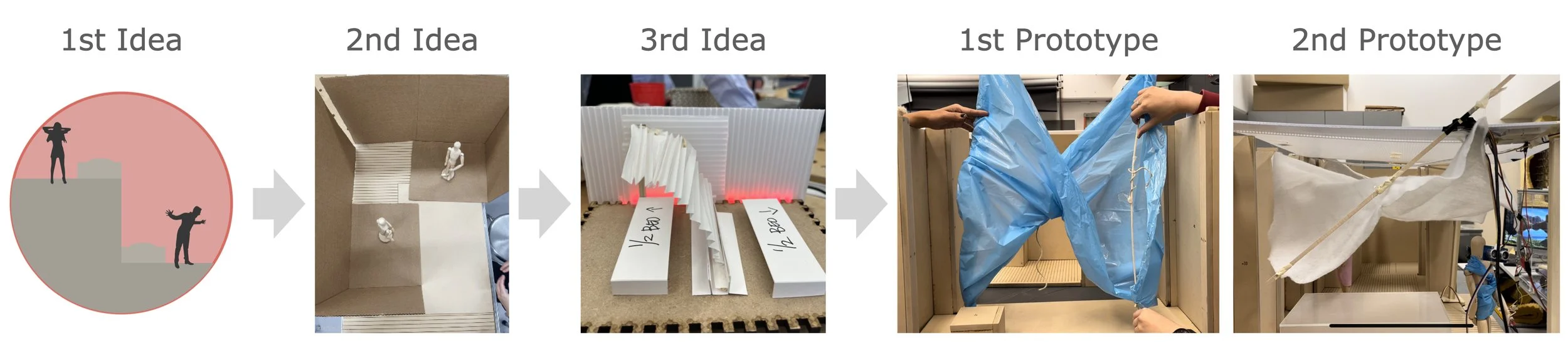 With the “two spaces in one place” idea in mind, we kept iterating. We developed 4 ideas and 3 prototypes in total, from moving floors, walls, curtains, and finally, the ceiling.