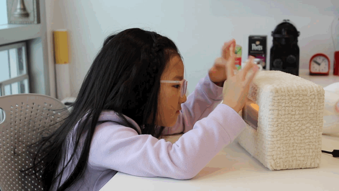 Prototype “Mo” resembles a small animal that welcomes proximity and touch. It has a rectangular opening on one of its sides where wiggly eyes open and close. We chose to install the wiggle eyes to provide “Mo” with liveliness and to further encourage children’s imagination. The eyes remain closed in the bright ambient but snap open when the sensibility features determine someone approaching, then it emits yellow light and a happy tune to show its excitement. We aim to provide positive feedback from proximity and touch for children with traumatic experiences, fostering a more healthy relationship with physical interaction for them.