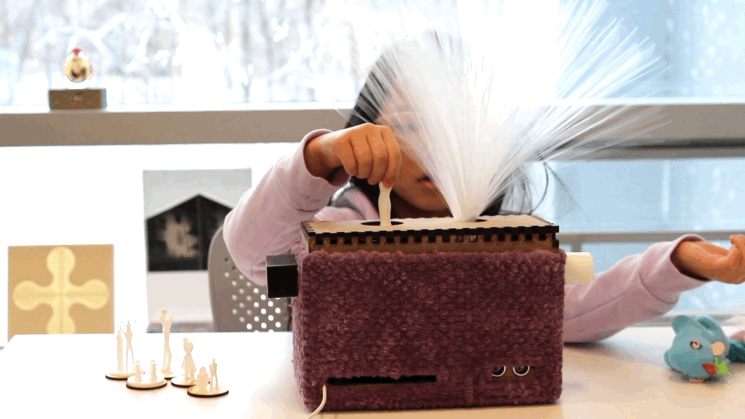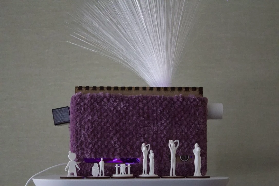 Prototype “Bo” is a box with a compartment that prompts children to insert miniature 3D figures of their choice - we have included a variety of characters such as a nuclear family, father, mother, grandparents, and teacher, courtesy of Thingiverse. These figures represent different natures of a social relationship; the caregiver should instruct the children to select the one they feel the most related to at the moment. The child would then put the figure of their choice into the compartment, where it sprouts out anemone-like tentacles. The compartment can be opened and closed to provide privacy, and the box welcomes touch by shining brighter as one comes close to it, functioning as a positive feedback loop.