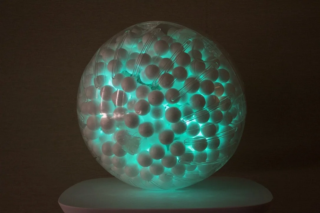 Prototype “e”, a ball-shaped toy wrapped by clear plastic, encourages aerodynamic movement; it is designed to prompt children to engage with it physically, such as twirling and shaking it. When the child shakes the ball, “e” reacts by changing the LEDs from cyan to purple in quick succession. These functions encourage the child to toss the ball around in various ways, warming them up to more openness, and it also gives the staff or therapist some insight into how the child is doing emotionally, and serve as an ice-breaker to a therapy session.