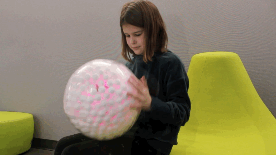 After receiving valuable feedback from our partner, Hillside Residential Center, we went on to develop an advanced prototype, “breathing ball.”, which owns the combined advantages from our three early prototypes. It starts breathing prompts after the child covers two randomly lit up LEDs on the ball’s surface – the breathing ball is aimed to calm children down when they are facing a crisis.