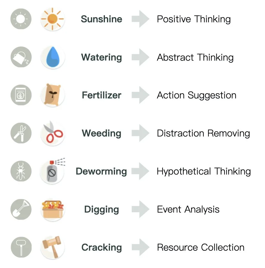 Moreover, to apply multi-perspective thinking on clarifying problems, we prepared 7 varieties of constructive questions, which leads to 7 corresponding ways to grow plants — we motivate users to answer questions in diverse directions, so that they can see their plants grow up in different ways.