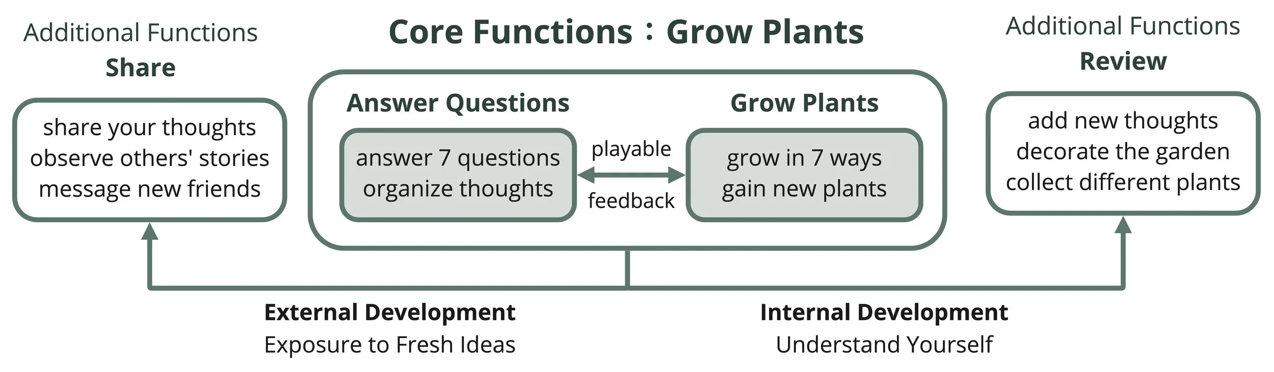 Users are thus able to create their own unique garden, with every single plant coming from an event they have ever dealt with, carrying their trains of thought at the time. In their garden, users can review their plants and the stories behind them, add new thoughts to them whenever they want, and share the plants to social media.