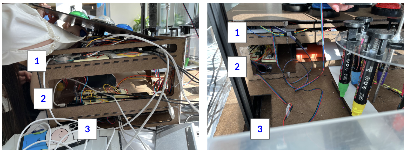 To record the composed music on paper, the seven buttons also trigger the rotation of a round plate connected to seven sponges of different colors. When one button is pressed, it activates a stepper motor along with the rotation, allowing the sponge with the appointed color to hover above the sheet; then, another stepper motor controls a gear to press the sponge, leaving a colored mark on the sheet.