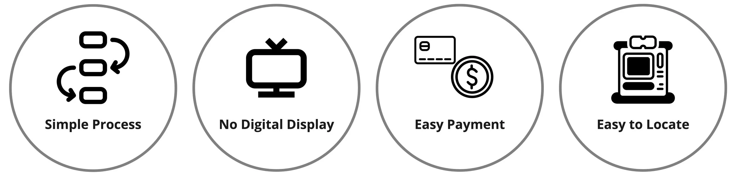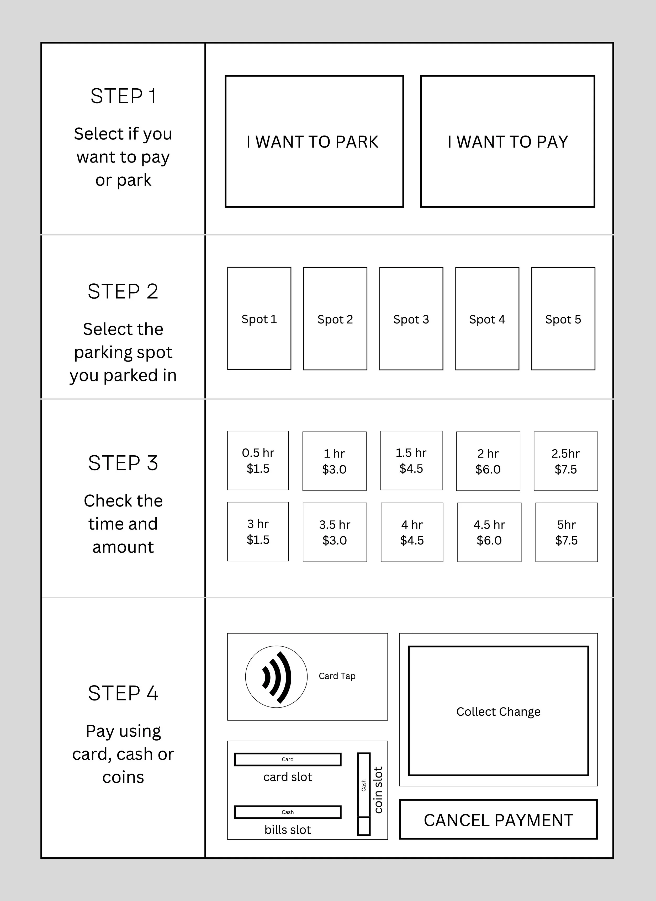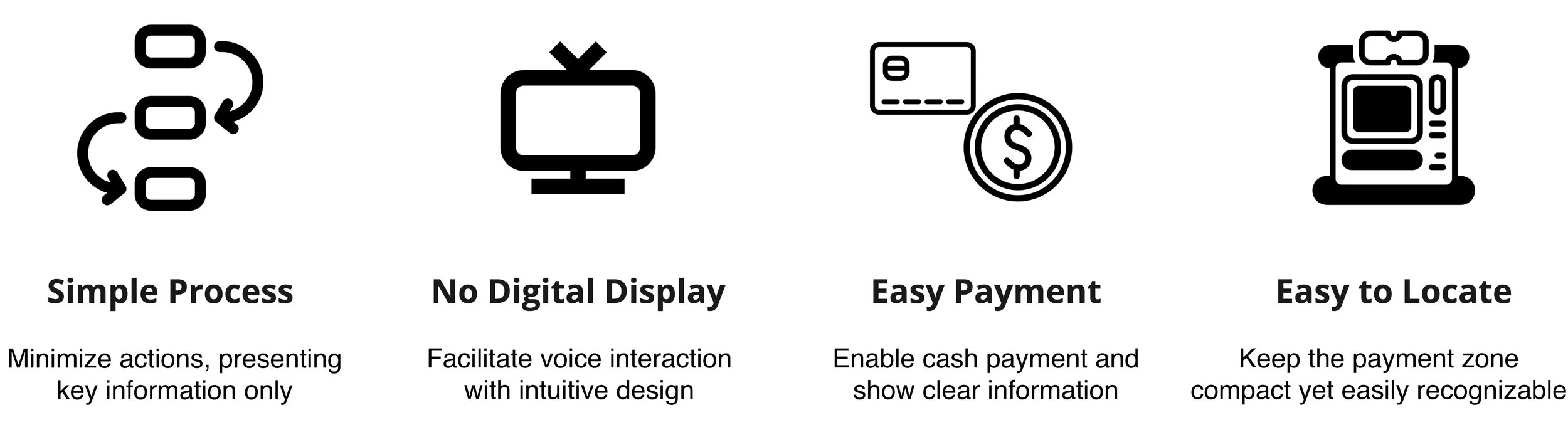 To encourage seniors to interact with the parking machine, the payment interaction needs to be as smooth as possible - it should be simple, and show only the necessary information. Furthermore, to adapt to seniors’ functional decline, the paying machine should not rely on digital display as the only communication channel.